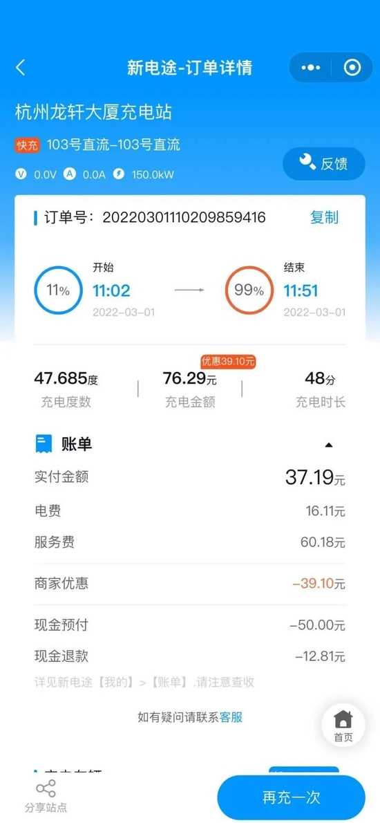 真正发现问题是在2022年1月,当时送的充电卡消耗完了,王先生发现付费充电的度数和车机标的度数总是不太一样,比如车机显示本次充电60度,但他实际只付了50度左右的电费。