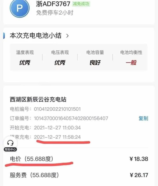 不仅这一次,几乎每一次的充电都有类似充电数据不符的情况,就拿2021年12月27日为例,这一次充电是几乎开到没电的情况下进行充电的,车机显示充电量是67kWh,实际付款的度数是55.68kWh,两者相差有12度之多,这还不包括充电过程中的线损,以及充电的加热包的用电亏损(每小时在1-3度左右)。