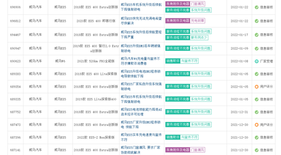 记者从车质网的投诉平台上查询到,关于威马汽车的投诉,几乎都是这样的字眼:威马EX5续航里程缩短影响正常使用、威马EX5升级后车辆无法充满电导致续航下降、威马EX5车机系统升级后续航下降强制锁电。
