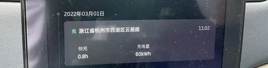 3月1日上午,记者和王先生来到云栖小镇龙轩大厦特来充电站,实地进行了充电尝试。当时车辆显示还有11%的电,花了48分钟充到99%,充电桩显示本次充电总度数为47.685度;但车机显示本次充电量60kWh,整整亏了近13kWh的电量。