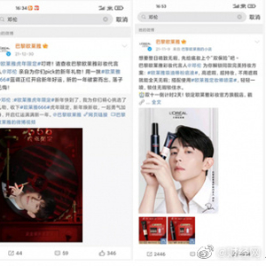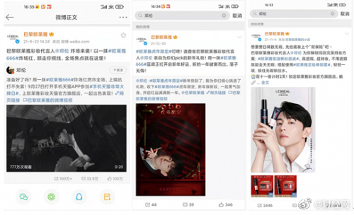 【#巴黎欧莱雅删除邓伦宣传物料#】 3月15日下午,财经网产经注意到,巴黎欧莱雅官方微博疑似已删除邓伦的所有微博。据财经网产经了解,去年9月,巴黎欧莱雅在转发邓伦的一篇“欧莱雅666”唇霜广告宣传微博时,称其为品牌彩妆代言人。