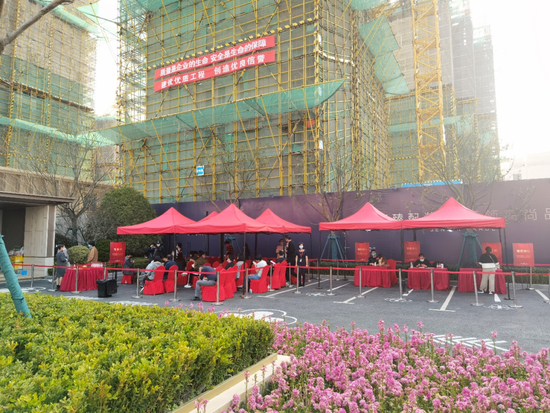 3月11日下午,时代周报记者探访御桥博翠认购现场。十余组购房者耐心等待入场,递交认购材料,陆续有购房者在大门口登记入内。