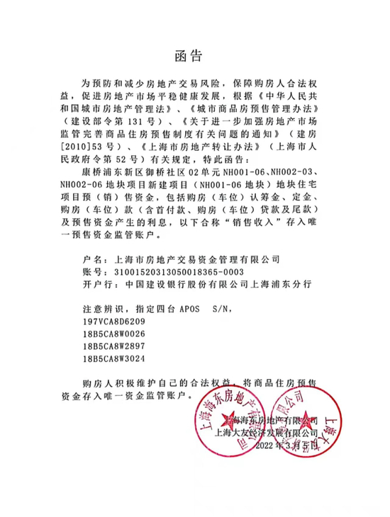 近期,御桥博翠官方微信号发布《函告》,称该盘的销售收入将存入唯一预售资金监管账户——上海市房地产交易资金管理有限公司,后者是上海市房地产交易中心搭建并指定的存量房交易资金监管平台。