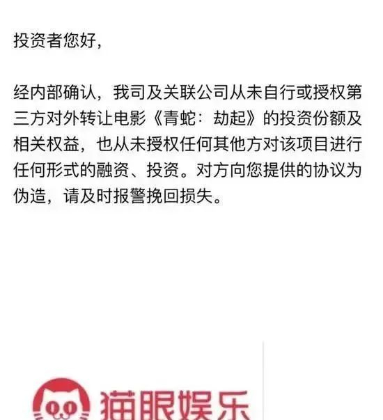然而,《长津湖》出品方博纳影业和《白蛇2:青蛇劫起》出品方猫眼娱乐均发布声明,从未授权任何第三方开展与这两部电影相关的融资、投资业务,建议被骗的投资者及时报警挽回损失。
