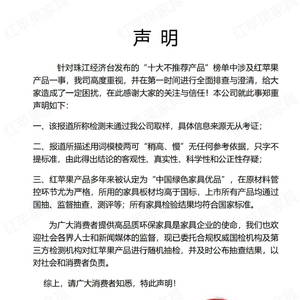 该声明称,针对珠江经济台发布的“十大不推荐产品〞 榜单中涉及红苹果产品一事,红苹果家具高度重视,并在第一时间进行全面排查与澄清。该报道所称检测未通过公司取样,具体信息来源无从考证。报道所描述用词模棱两可“稍高、慢〞无任何参考依据,只字不提标准,由此得出结论的客观性、真实性、科学性和公正性存疑。
