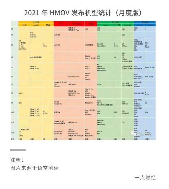 看去年的情况,vivo依旧坚持着这一上古战略。据《悟空评测》统计,2021年小米、Redmi和黑鲨共发布了25款手机,华为、荣耀分别发布了12款和23款,OPPO发布了21款,vivo发布36款,同时,维沃系下的iQOO还发布了13款。