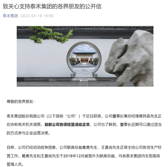 3月16日晚间,上市房企泰禾集团(000732.SZ,以下简称“泰禾”)发布重大事项公告称,“董事会于近日获悉,公司董事长兼总经理黄其森先生正在协助有关机关调查。公司董事会已经启动应急预案。目前,公司联席总裁葛勇先生和联席总裁王景岗先生正常主持公司各项生产经营工作。”