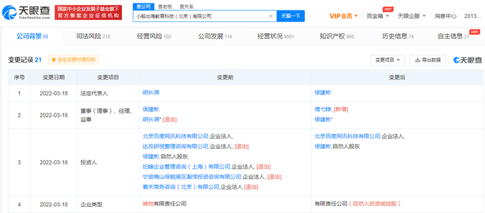 天眼查App显示,3月18日,作业帮关联公司小船出海教育科技(北京)有限公司发生多项工商变更,达孜研悦管理咨询有限公司、襄禾商务咨询(北京)有限公司等退出股东行列,同时公司法定代表人由胡长涓变更为侯建彬。
