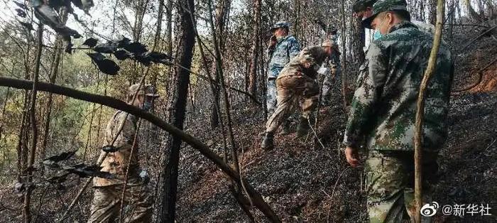 ▲东航客机坠毁现场明火已扑灭直击消防人员山林中搜救。