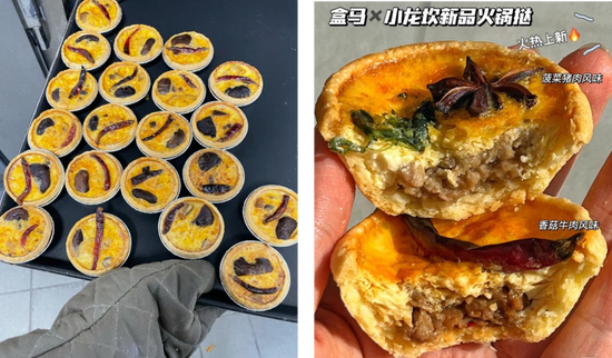 起源于葡萄牙的蛋挞,就和蒙古人发明的火锅,也在盒马上实现了合体。香菇牛肉味和菠菜猪肉味的小龙坎火锅蛋挞,让许多人直呼不可思议;而蛋挞上出现的香料,更是满满的一股黑暗料理风。