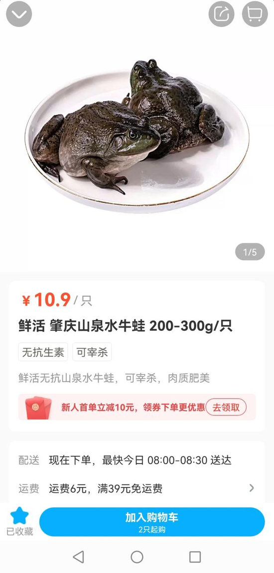 不过,在定位于广州的盒马App上,我们发现牛蛙竟然是活的,并且是两只起售。
