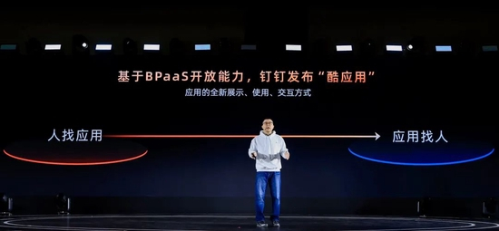 BPaaS在钉钉目前的产品体系中打头阵的是“酷应用”。低代码改变应用的创建方式,酷应用改变应用的使用方式。企业客户可以在钉钉工作群里或聊天窗口中直接调起应用组件,不需要下载安装应用,也无需跳转到别的界面。钉钉生态里的相关应用,可以用卡片的方式推倒群、单聊、日历、文档等场景中。从“人找应用”变成了“应用找人”,实现沟通即业务。使用酷应用以后,企业的低频软件会出现在高频的沟通流中,以高频带低频。