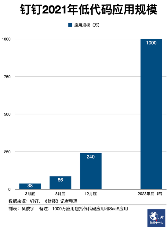 钉钉在2021年做了APaaS(Application Platform as a Service,应用流程即服务),也就是用低代码能力为客户和伙伴提供普惠化应用开发能力。按照钉钉2021年初制定的增长目标,三年后的2024年,钉钉平台总的“钉应用”规模将增长至1000万。这意味着年平均增速将达到50%-60%。