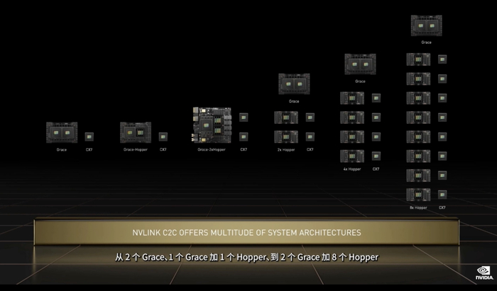 有“Hopper”也有“Grace”,在GTC大会上,黄仁勋也介绍了超级服务器芯片Grace的最新进展:Grace Hopper超级芯片和Grace CPU超级芯片,前者由由一个Grace CPU和一个Hopper架构的GPU组成;后者由两个Grace CPU组成,通过NVIDIA NVLink-C2C技术互连,包括144个Arm核心,内存带宽高达1TB/s,能耗500w。