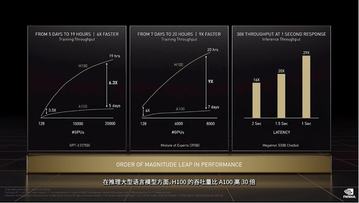 具体而言,无论是GPT-3(1750亿参数),还是“对于大型Transformer模型训练,H100将提供高达9倍的性能,过去需要数周时间才能完成的训练可以减少到几天内,”NVIDIA产品管理高级总监Paresh Kharya在发布会上表示。
