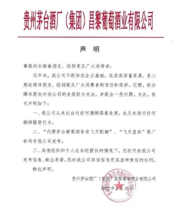 茅台葡萄酒在声明中表示,茅台葡萄酒公司从未出台过任何捆绑搭售政策,也从未进行任何捆绑搭售行为;代理茅台葡萄酒享受飞天配额”、“飞天直供”等广告均非茅台葡萄酒公司公司发布;其他组织和个人在未经授权的情况下,无权代表茅台葡萄酒公司发布信息做出承诺,同时茅台葡萄酒公司将保留追究其法律责任的权利。
