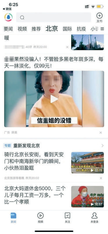 “不管脸多黑老年斑多深,每天一抹淡化,仅99元!”这是腾讯新闻关怀版中出现的一则针对老年人的广告。
