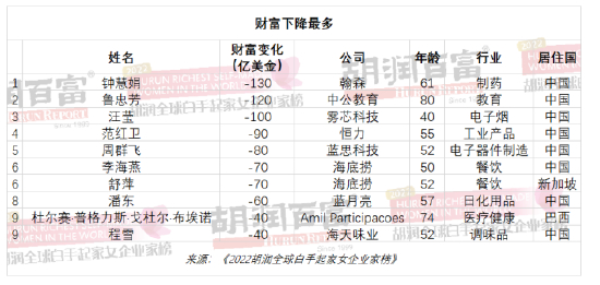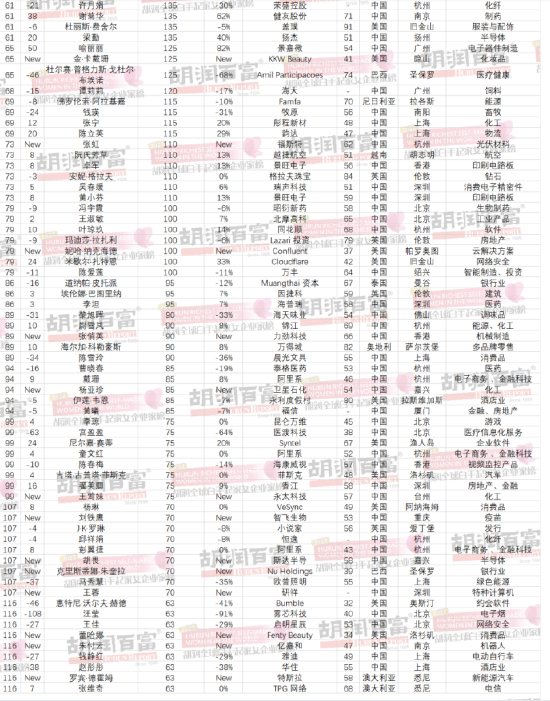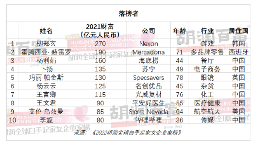 85位财富比去年下降,其中25位跌出榜单。落榜者包括海底捞44岁的杨利娟、苏宁49岁的卜扬,以及韩国游戏公司Nexon和西班牙零售商Mercadona的创始人