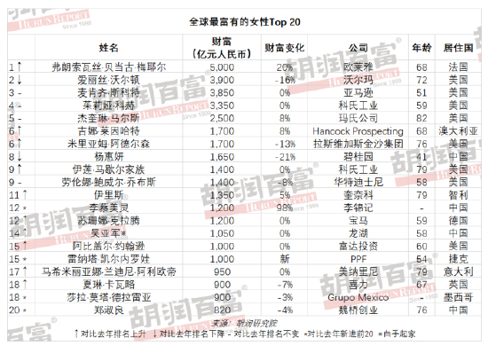 全球最富有的20位女性中,只有吴亚军是白手起家的,19位是继承财富的。而全球最富有的20位男性中,15位是白手起家的,5位是继承财富的。欧莱雅68岁的弗朗索瓦丝·贝当古·梅耶尔超过沃尔玛72岁的爱丽丝·沃顿成为全球女首富,财富5,000亿元