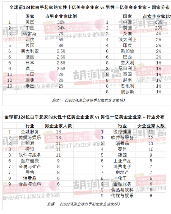 “对比这124位白手起家的十亿美金级女企业家与前124位白手起家的十亿美金级男企业家,我们得出了一些有趣的发现。男性更富有,是女性的十倍。仅埃隆·马斯克和杰夫·贝佐斯两人的财富就超过了所有十亿美金级女企业家的总和。从行业来看,男性企业家更多从事金融服务和传媒行业,而女企业家更多从事医疗健康和消费品行业。”