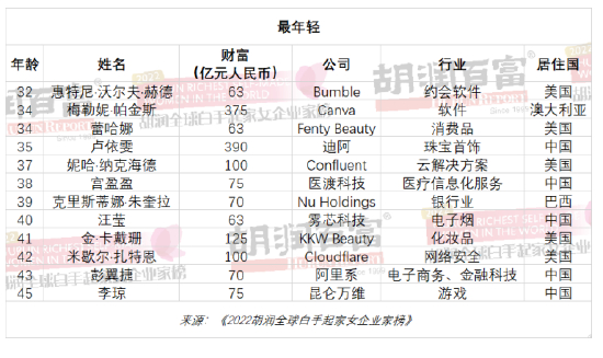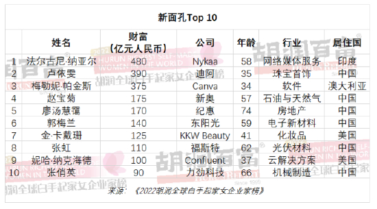 19位新面孔,比去年的43位有所下降。其中12位来自中国。排名最靠前的是印度化妆品零售商Nykaa 58岁的法尔古尼·纳亚尔,财富480亿元排名第十;其次是来自中国的DR钻戒35岁的卢依雯,财富390亿元排名前二十;以及澳大利亚在线平面设计软件Canva 34岁的梅勒妮·帕金斯,财富375亿元排名前二十