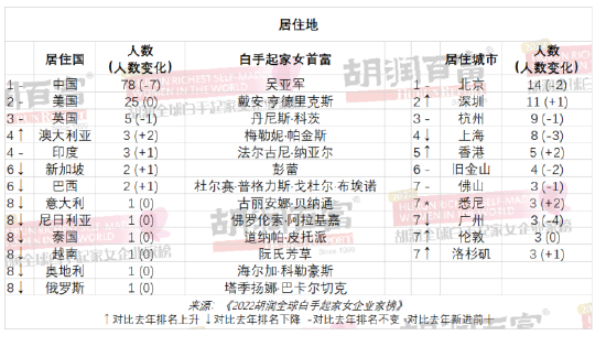 中国拥有世界上三分之二最成功的女性企业家,有78位,比去年减少7位,但几乎是位居第二的美国的四倍。美国25位,和去年一样。英国以5位排名第三。澳大利亚增加2位至3位,从第五上升至第四。印度增加1位至3位,新加坡和巴西各自增加1位至2位,十年前印度、新加坡和巴西一位都没有。