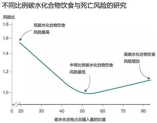 《柳叶刀·公共卫生》上一项对43万人长达25年追踪的研究表明,碳水化合物的摄入量和预期寿命存在 U 形关系,低碳水化合物饮食会缩减预期寿命长达4年。