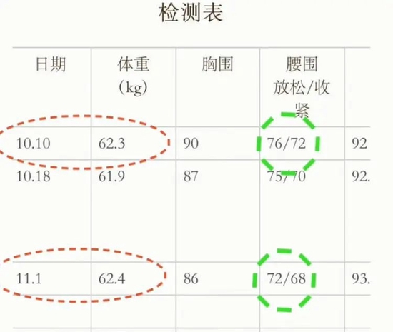 B站up主@娜佳健身 是一名健康营养师,她的学员在很多情况下并不会掉体重,但会掉“围度”,比如腰围、腹围、大腿围等。虽然学员们可能一个月都没有掉1公斤的体重,但是腰围度却明显减小了。