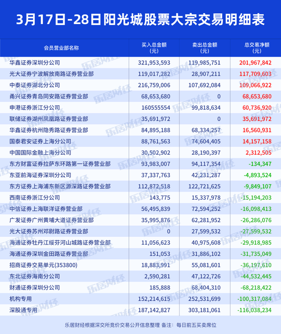 在此期间,大额买入阳光城交易净额最多的前五家是华鑫证券深圳分公司、光大证券宁波解放南路证券营业部、中泰证券湖北分公司、甬兴证券青岛同安路证券营业部、申港证券浙江分公司,累计交易净额分别约为2.02亿元、1.18亿元、1.09亿元、0.69亿元、0.61亿元。