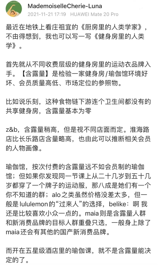 生活博主MademoiselleCherie-Luna(下文简称“扯老师”)就认为lululemon的上身率与当地健身房的景气指数息息相关,并戏谑地提出了“含露量”的概念。