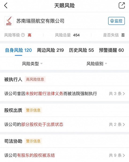 天眼查APP显示,2022年以来,苏南瑞丽航空先后三次被列为被执行人,执行标的分别为3.58亿元、0.63亿元和1.14亿元,被执行总金额5.36亿元,天眼查APP将被其执行的信息列为“高风险信息”。