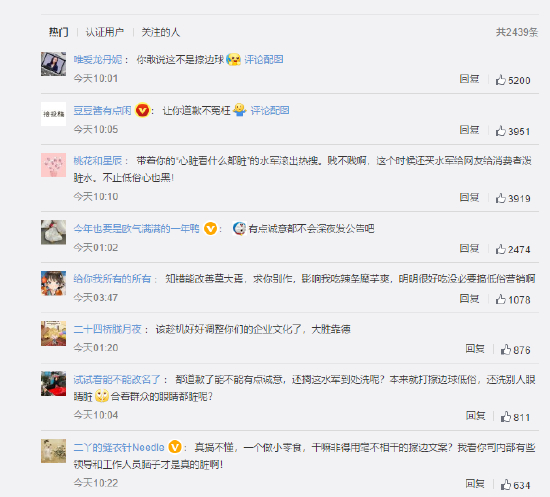 不过卫龙的道歉并没有让网友们满意,“有点诚意都不会深夜发公告吧”,“都道歉了能不能有点诚意,还搁这水军到处洗呢?本来就打擦边球低俗,还洗别人眼睛脏”。