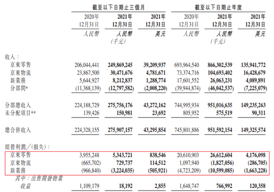 2021年第四季度及全年京东零售、物流及新业务业绩情况(千元)
