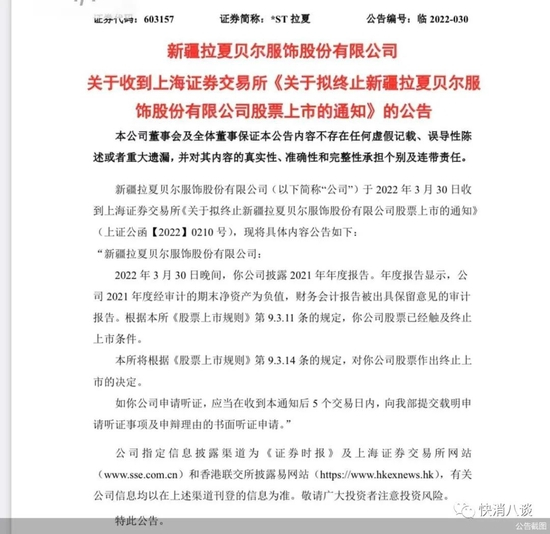 拉夏贝尔财报披露的同时,上交所也第一时间对拉夏贝尔下发了《关于拟终止新疆拉夏贝尔服饰股份有限公司股票上市的通知》的公告。公告显示,拉夏贝尔2021年度经审计的期末净资产为负值,财务会计报告被出具保留意见的审计报告。根据本所《股票上市规则》第9.3.11条的规定,拉夏贝尔公司股票已经触及终止上市条件。根据《股票上市规则》第9.3.14条的规定,上交所对拉夏贝尔公司股票作出终止上市的决定。