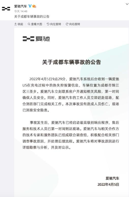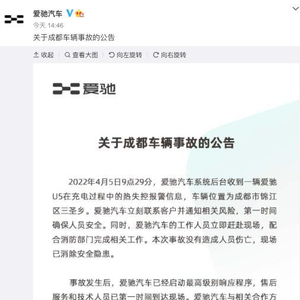 爱驰汽车发布成都U5自燃事故公告:未造成人员伤亡