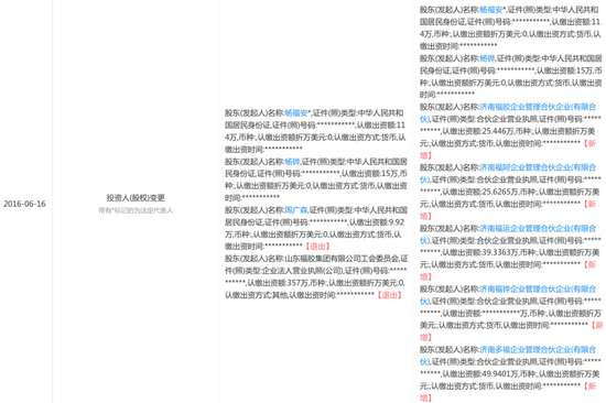 工商登记资料显示,在2016年6月16日,福胶集团东阿镇公司股东由杨福安、杨铧、周广森、山东东福胶集团有限公司工会委员会变更为杨福安、杨铧以及五家合伙企业。