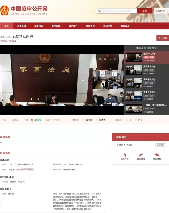 此案案由为股权转让纠纷,案号为(2022)鲁0124民初642号,案件已经在3月16日上午在平阴县人民法院东阿家事法庭进行了开庭审理。