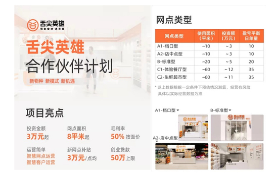 加盟条件看似非常诱人: 加盟门店一共有5种店型,最小只需10平米左右,投资金额最低3万元。宣传材料称,如果菜品不打折,毛利率可达50%。规模最小的两种店,每日卖十单即可盈亏平衡。
