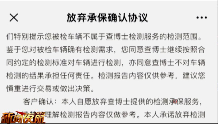 记者注意到,上述报道中提到了消费者与查博士平台签署了“放弃承保确认协议”,该协议显示“查博士不对车辆检测的结果承担任何责任,检测报告内容仅供参考,建议您慎重进行交易或作出决策”。有业内人士认为,“查博士”提供检测服务,却不对检测结果承担责任的做法属于“霸王”行为。
