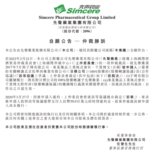 近日,先声药业发布公告称,在收购托毕西药业100%股权的纠纷中仲裁胜诉,托毕西药业100%股权转让予先声药业。