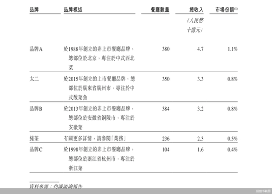 排在其前位的三个品牌虽未全部实名,但根据北京商报记者从其披露的资料来看,上述三个品牌分别为西贝、太二以及小菜园,其市场占有率分别为1.1%、0.8%、0.8%。三个品牌2021年总收入分别为47亿元、33亿元以及32亿元。