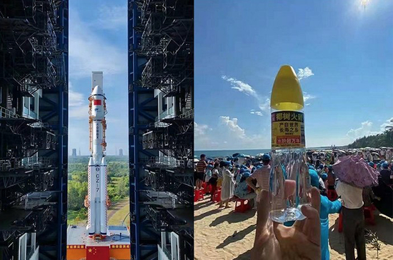 2021年9月,长征七号遥四运载火箭在中国文昌航天发射场点火升空成功,椰树集团推出火箭瓶国宝椰树长寿泉矿泉水。