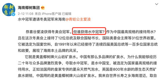 2月12日,谷爱凌获得冬奥会首金后,椰树集团发文祝福,随即话锋一转,自问自答“谁是水中冠军”,推广黄盖椰树牌火山岩矿泉水。