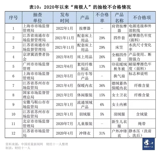 在2020年以来各地市场监管部门组织的质量监督抽查及消费者协会检测中,“南极人”有12次被检出产品不合格,涉及按摩器、床上用品、保暖内衣、被子、女装、内裤、羽绒服、换气扇、新生儿衣服及冲锋衣。