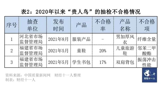 在2020年以来各地市场监管部门组织的产品质量监督抽查中,贵人鸟有3次被检出产品不合格,涉及风衣、童鞋及双肩包。