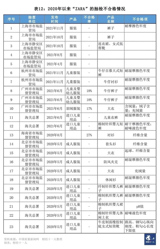 例如,2021年11月,上海市市场监管局公布的行政处罚公告显示,飒拉服饰(上海)有限公司销售的3款“ZARA”裤子耐摩擦色牢度项目不符合标准要求。2021年10月,上海市市场监管局公布的行政处罚决定书显示,飒拉商业(上海)有限公司因销售以不合格产品冒充合格产品的裤子。同月公布的上海市静安区市场监管局行政处罚决定书显示,飒拉商业(上海)有限公司经销的女式低帮靴和连衣裙等产品经检验检测机构检验,判定为不合格。