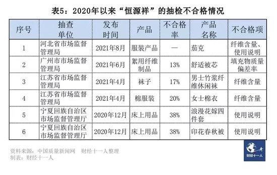 在2020年以来各地市场监管部门组织的质量监督抽查中,恒源祥有6次被检出产品不合格,涉及被芯、夹克、男士休闲袜、女士棉衣、床上用品。