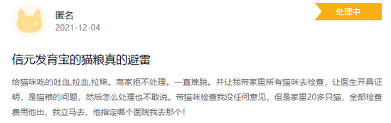 值得注意的是,早在去年12月,便有消费者曾在黑猫投诉平台投诉信元发育宝猫粮。