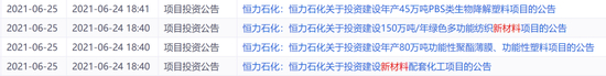 去年6月24日,恒力石化连发四份项目投资公告,涵盖新材料配套化工项目、功能性聚脂薄膜、功能性塑料、PBS类生物降解塑料、高性能树脂等。