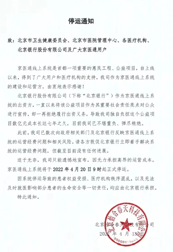 4月18日晚间,怡合春天发布的一份《停运通知》在网上流传,公司自称是京医通线上系统的建设和运营方,但由于北京银行作为出资方“一再拒绝履行出资义务”,导致公司独自负担该公益项目数亿元成本长达7年之久,目前已经“不堪重负、弹尽粮绝”。